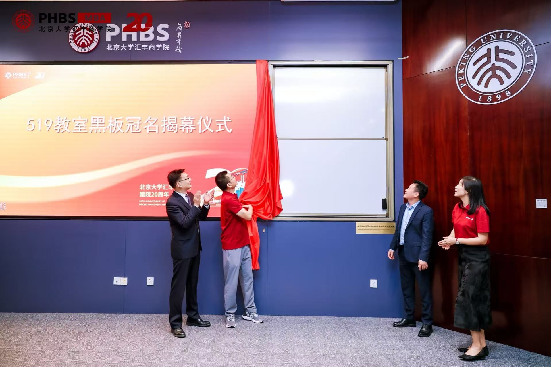 而在自己事业攀上更高峰之际,大家都没有忘记学院的培养。除了集体创作国画,共同捐赠“金砖”,2017级MBA校友中,还有杨峻峰为学院519教室捐赠黑板,石锐在福田汉国中心外墙为学院投放了亮灯广告,让“北大汇丰20周年”闪耀在深圳的夜空。